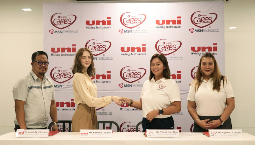 Cherry Cares by MSN Foundation Inc. (MSNFI) and UNI ballpen, distributed by Pelli-San Corporation, re-inks partnership on August 24, 2022 for Be Cool In School program. It was attended by Cherry Cares by MSN Foundation Inc. President, Ms. Venus Tan-Ngu, PR-CSR Head, Ms. Agnes Conopio, Peli-San Corporation Director, Ms. Katrina Pellicer, and National Sales Manager, Mr. Joseph Byron Aquino.