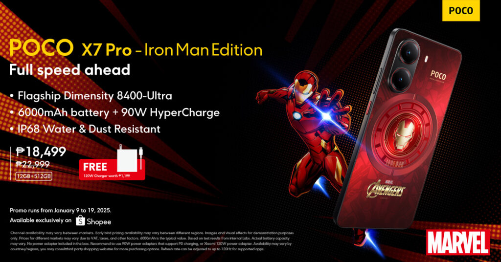 The POCO X7 Pro – Iron Man Edition is available for P22,999 and a special promo price of P18,499. From January 9 to 19, 2025, you can get a free 120W Charger worth P1,199 when you purchase the POCO X7 Pro – Iron Man Edition on Shopee.
