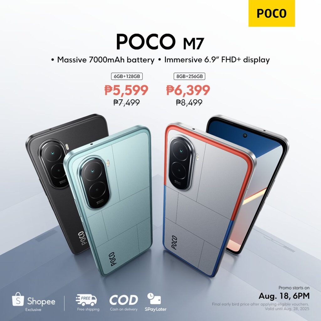 The POCO M7 will be available in the Philippines starting August 18, 2025, 6PM in two variants: 6GB + 128GB and 8GB + 256GB, priced at ₱7,499 and ₱8,499, respectively. From August 18 6PM to 31, buyers can enjoy special early bird prices of just ₱6,999 and ₱7,999. Available in Silver, Blue, and Black, the POCO M7 delivers long battery life, a large display, and next-generation features at an affordable price. POCO fans can purchase the Shopee-exclusive device online through the official POCO Global Store