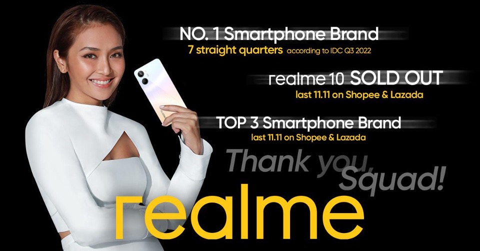 The entire realme community is in high spirits with the recent news of the brand topping the local smartphone ranking for seven straight quarters already (based on IDC shipment sell-in reports for Q3 2022)! The celebration doesn’t end there because realme also scored the number 1 spot for Q3 2022 based on Canalys’ report. To top it all off, the recently launched realme 10 (8GB+128GB) achieved sold-out records during the 11.11 mega sale on both Shopee and Lazada. All these milestones and it’s only halfway through the month!