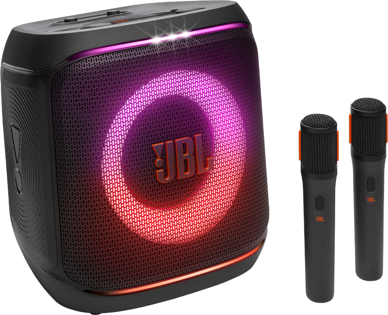 Prefer something more compact? The PartyBox Encore 2 brings the big energy in a tighter frame. Dual wireless mics come standard—perfect for karaoke nights—and the AI Sound Boost ensures every vocal run and backing track comes through with clarity and punch.