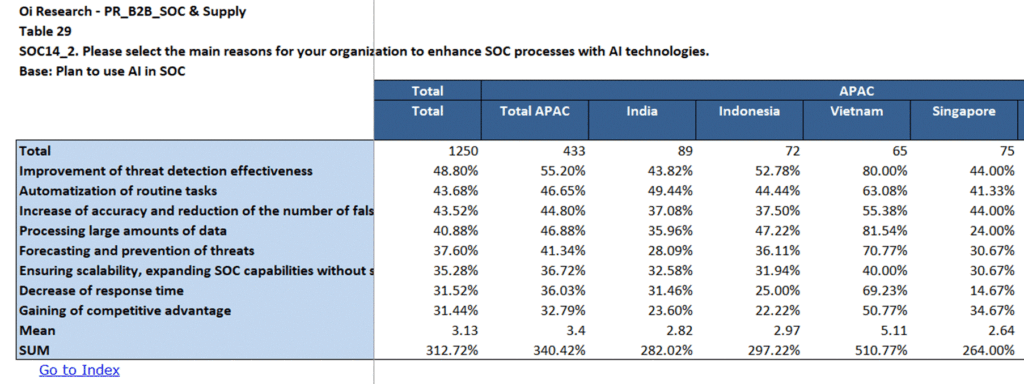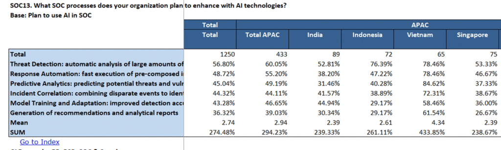 When it comes to practical use cases, organizations in APAC primarily expect AI to strengthen threat detection capabilities through automated analysis of data to identify anomalies and suspicious activities (60%) and to facilitate response automation, enabling rapid execution of predefined incident response scenarios (55%).