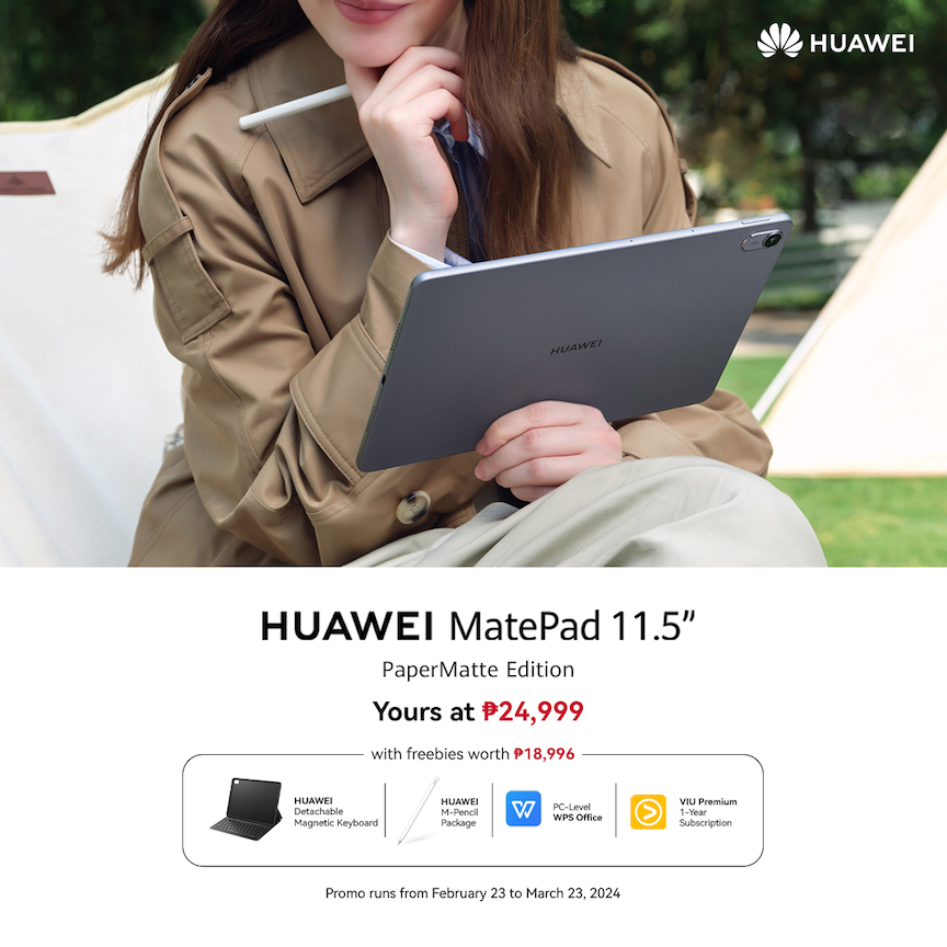 Prepare to embark on a journey of unparalleled innovation with the highly anticipated release of the HUAWEI MatePad 11.5-inch PaperMatte Edition. Priced at PHP 24,999, this revolutionary tablet will be hitting shelves starting February 23. A bundle of freebies worth up to P18,996 will also come with each model. This includes a Detachable HUAWEI Smart Magnetic Keyboard, HUAWEI M-Pencil 2nd Gen, PC-Level WPS Office, and a one-year premium subscription to VIU. Potential consumers can also purchase the device on the HUAWEI Store and Huawei’s official stores on Lazada and Shopee.