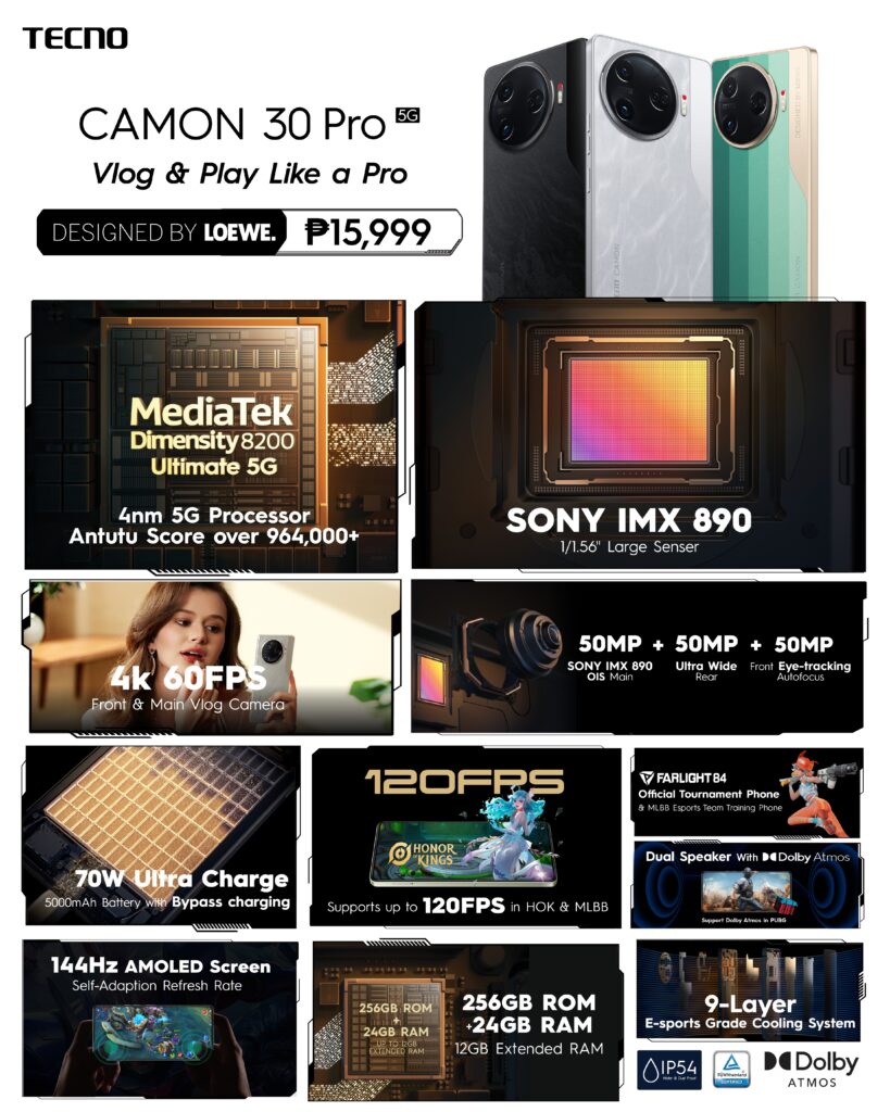 TECNO’s CAMON 30 Pro 5G lets you vlog and play like a pro with its Triple 50MP camera system with SONY IMX 890 50MP OIS on main camera, 4K 60fps Eye-tracking Autofocus front camera and ultrawide rear camera, Mediatek Dimensity 8200 Ultimate 5G processor, 70W Ultra Charge with 5000mAh, and 24GB RAM + 256GB ROM (extended 12GB RAM) all for the price of P15,999.